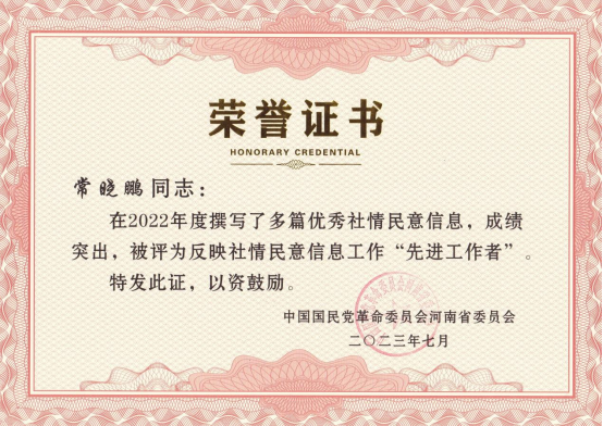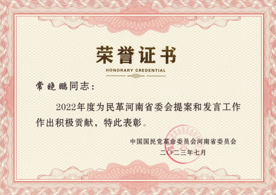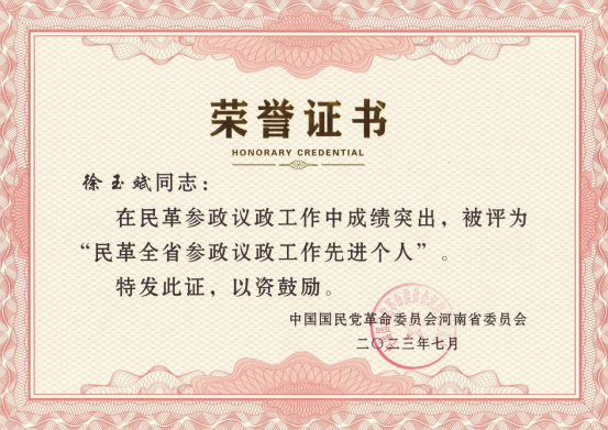 近日,民革河南省委会发布表彰,我校民革支部主委、民革省委会教育文化委员会委员徐玉斌,被民革河南省委会评为“民革全省参政议政工作先进个人”;期刊中心副主任、民革支部委员、民革省委会教育文化委员会委员常晓鹏,被评为2022年度为民革河南省委会提案和发言工作积极贡献奖和2022年度反映社情民意信息工作“先进工作者”。