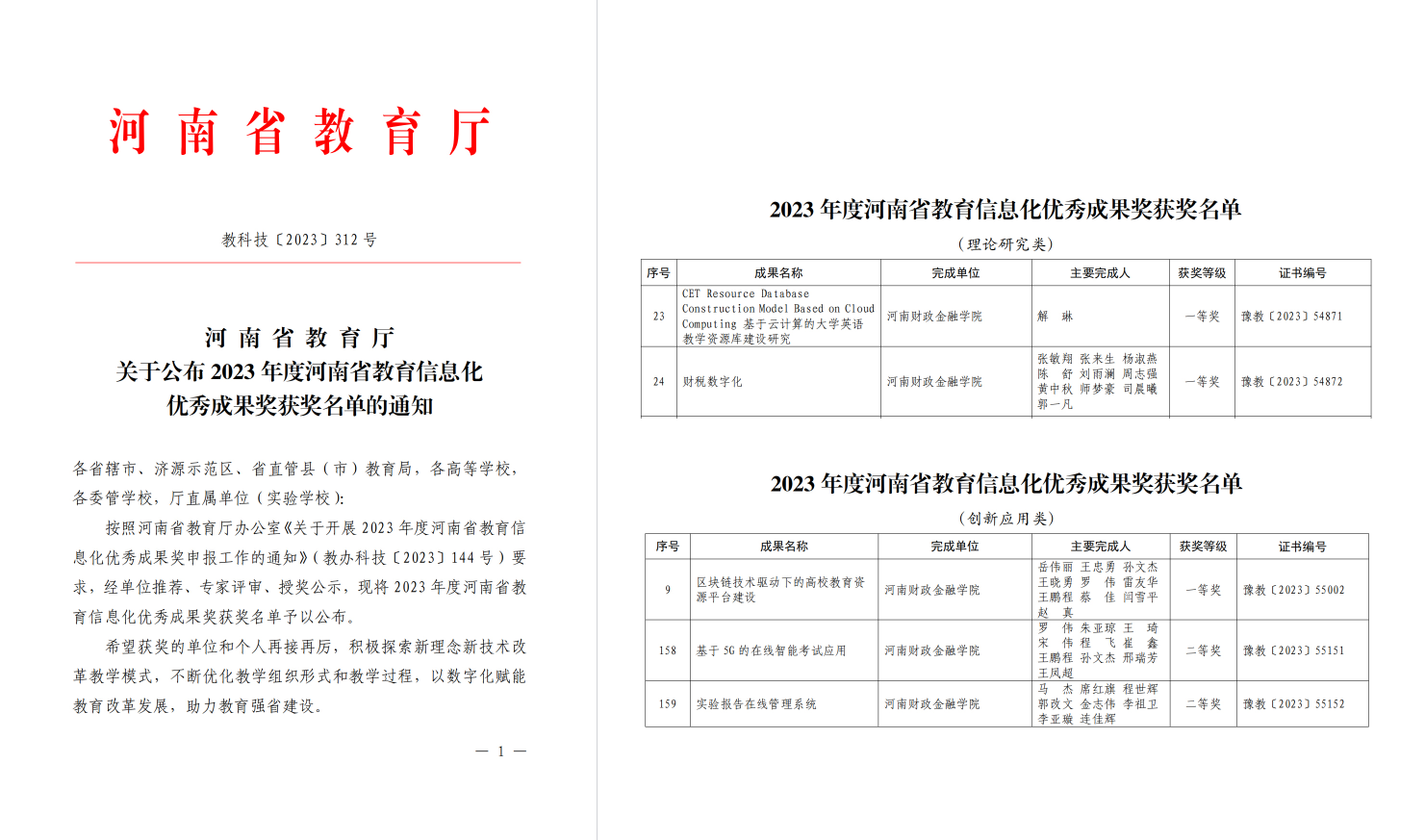 近日,河南省教育厅下发了《关于公布2023年度河南省教育信息化优秀成果奖获奖名单的通知》(教科技〔2023〕312号),我校共有5项成果获奖,其中理论研究类成果一等奖2项;创新应用类成果一等奖1项,二等奖2项。