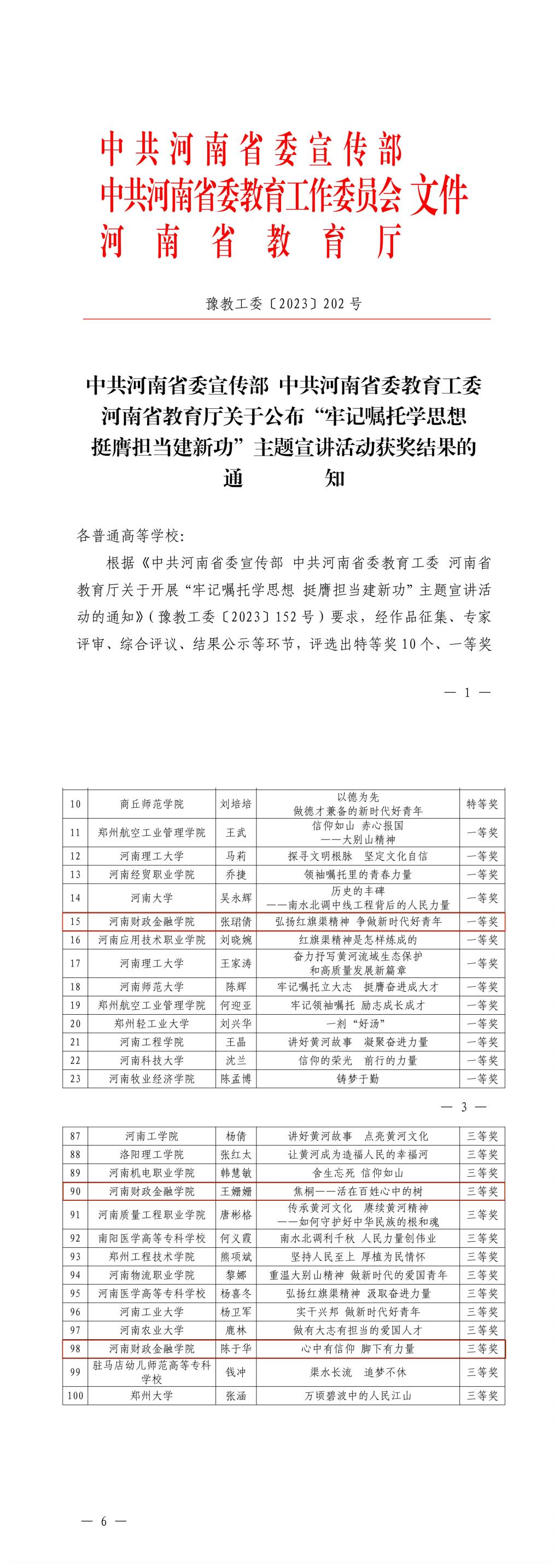 近日,中共河南省委宣传部、中共河南省委教育工委、河南省教育厅下发了《关于公布“牢记嘱托学思想 挺膺担当建新功”主题宣讲活动获奖结果的通知》(豫教工委〔2023〕202号),我校多位教师获奖。