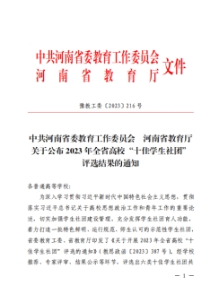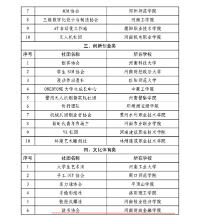 近日,中共河南省委教育工作委员会、河南省教育厅下发了《关于公布2023年全省高校“十佳学生社团”评选结果的通知》(豫教工委〔2023〕216号),我校读书协会荣获河南省高校文化体育类“十佳学生社团”荣誉称号。