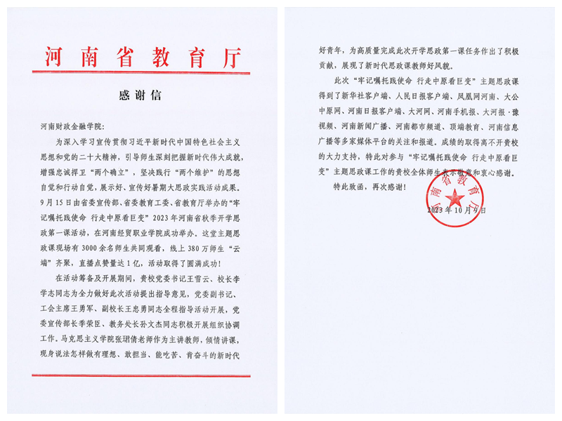 近日,河南省教育厅向我校发来感谢信,对我校大力支持“牢记嘱托践使命 行走中原看巨变”2023年河南省秋季开学思政第一课活动表示感谢,对学校领导、相关单位、参与主题活动的全体师生表示敬意和衷心感谢。