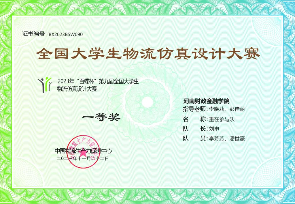 11月20日,“百蝶杯”全国大学生物流仿真设计大赛圆满结束,由我校工商管理学院彭佳丽、李晓莉老师指导,刘申、李芳芳、潘世豪同学组建的参赛团队,在省赛优异成绩的基础上荣获国赛一等奖。彭佳丽老师和李晓莉老师荣获优秀指导教师,我校荣获河南省“优秀组织奖”。