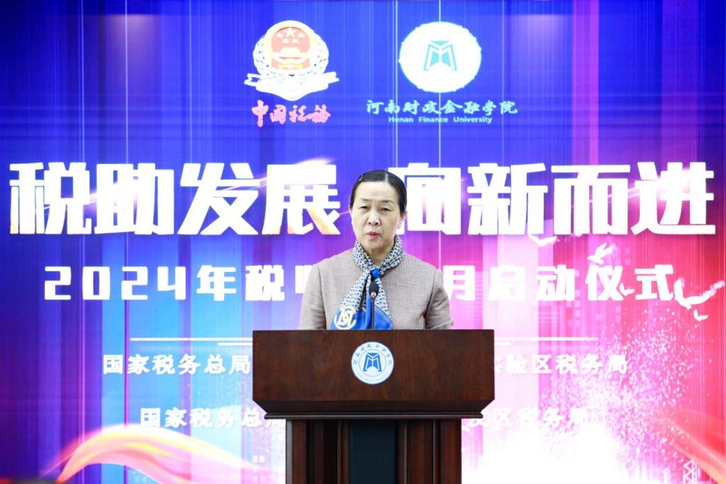 王雪云在致辞中首先对出席此次活动的郑州航空港经济综合实验区税务局孙乾毅副局长一行表示热烈欢迎。她指出,税收是国家推进中国式现代化、改善人民生活水平、提升国民幸福指数的重要基石。新时代的税收工作,不仅要有健全的税法体系和现代化的税收征管,更需要在全社会大力营造依法诚信纳税的社会氛围。每年4月的税收宣传月,是税务部门与社会各界的“春风之约”,今天在我校举办税收宣传月启动仪式,不仅有助于增强学生法治观念,提升社会责任感,更有利于推动全社会形成学税、懂税、护税的浓厚氛围。她向学生倡议,认真学习税收知识,深入了解税收政策,切实增强税收法治理念,努力讲好税收故事,弘扬税收文化,做一名优秀的税收宣传员和税法践行者,为充分发挥税收作用、推动新质生产力和高质量发展,作出新时代青年应有的贡献。她要求财税学院积极协助郑州航空港实验区税务局认真组织,精心安排,普及税法知识,扎实推进“税收宣传进校园”活动。希望学校与郑州航空港区税务局进一步开拓创新、紧密合作,把“校税共建”工作提高到更高的层面,为财税系统培养更多更优秀的涉税人才。