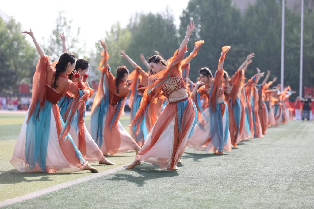 在开幕式的表演环节,教职工带来歌伴舞节目《壮丽航程》,老师们用高亢的歌声唱出伟大祖国的宏伟壮丽,用婀娜的身姿舞出气势磅礴的恢宏旋律,用自己的满腔热忱祝福我们的学校蓬勃发展,扬帆远航。校团委和金融学院团总支指导学生带来的舞蹈《盛世舞千年》,舞者轻盈跃动,如仙子下凡,衣袂飘飘,似流水般灵动。体健学院500名学生带来特色节目《龙腾盛世》,同学们高擎红旗,摆出“永利强”字样,同学们笑靥如花,洋溢着勃勃生机。2023年全国轮滑锦标赛速滑冠军魏惊骁同学身着轮滑装备高举校旗迎面而来,炫酷的轮滑技艺赢得现场观众的热烈掌声,将开幕式推向高潮。开幕式表演节目精彩纷呈,激扬的歌声和欢呼声响成一片,师生用歌声和舞蹈为新中国成立75周年献上永利人最真挚的祝福!