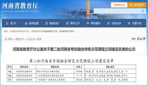 近日,河南省教育厅办公室发布了《关于公布第二批河南省专创融合特色示范课程立项建设名单的通知》(教办高〔2024〕144号),我校申报的《保险产品设计与保险规划》《人力资源管理与创新创业实践》《“互联网+”创新创业工程实践》三门课程全部获批省级立项建设,这体现了我校专业教育与创新创业教育相融合的建设成果,也是对我校创新创业教育实践改革的进一步肯定。