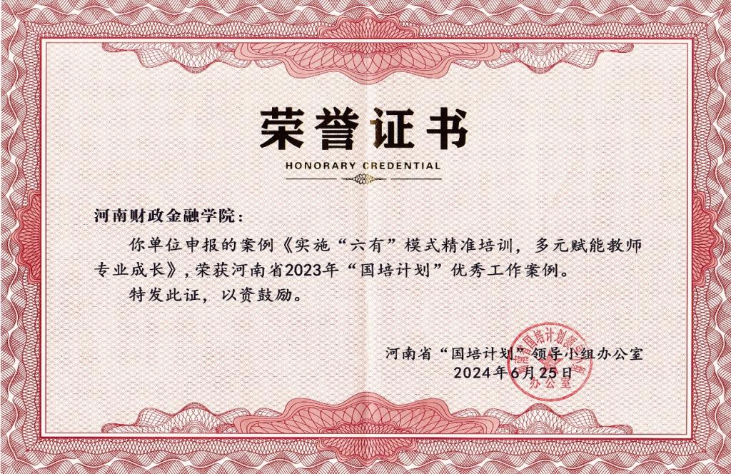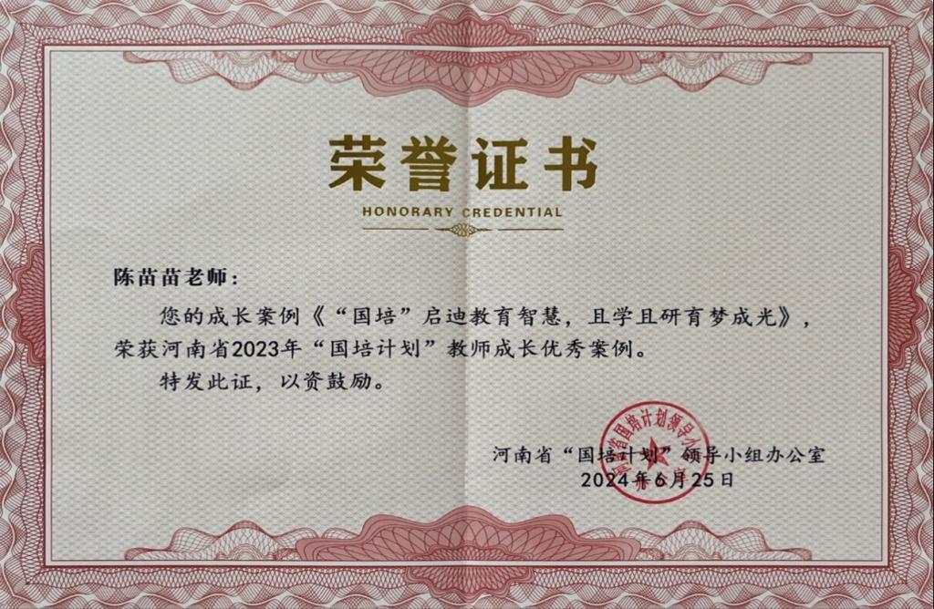 近日,河南省教育厅公布2023年“国培计划”优秀案例遴选结果,我校打造的“六有”精准培训模式荣获“国培计划”优秀工作案例,我校国培学员陈苗苗荣获“国培计划”教师成长优秀案例,并在全省“国培计划”高级研修班上做典型发言。省教育厅在2024年河南省“国培计划”“省培计划”管理者高级研修班上,为入选2023年“国培计划”优秀案例的单位和个人颁发了证书。