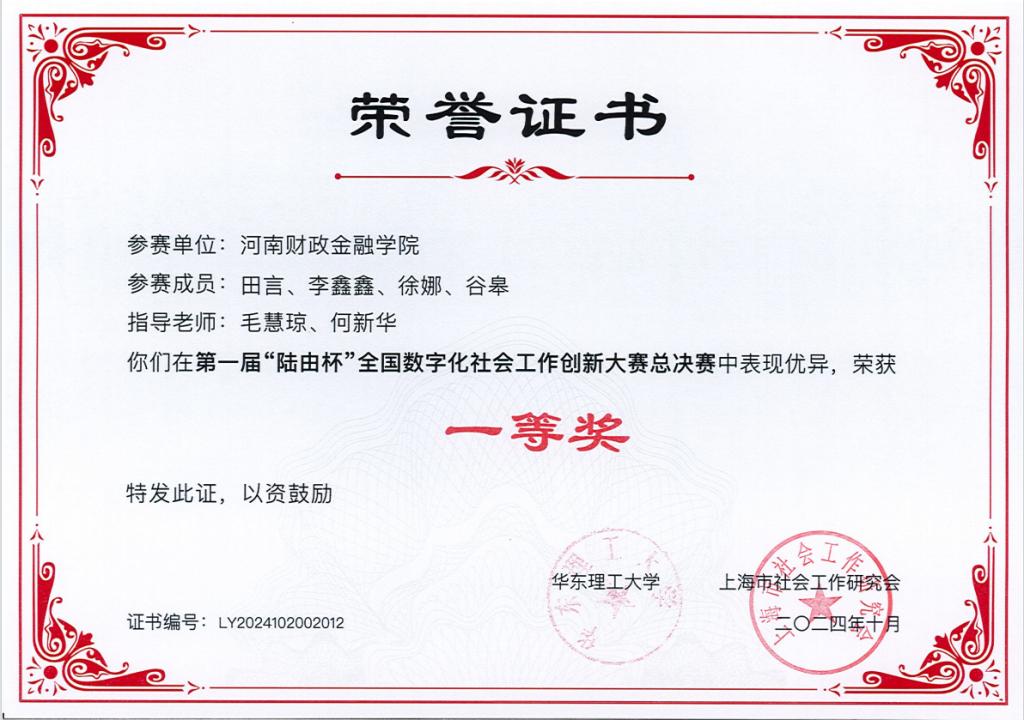 10月18日至20日,第一届“陆由杯”全国数字化社会工作创新大赛总决赛在华东理工大学徐汇校区举行。我校由法学院社会工作专业学生田言、李鑫鑫、徐娜、谷皋等组成的代表队表现卓越,荣获本科组一等奖。