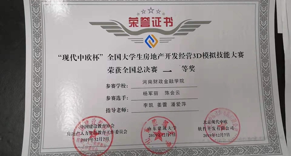 12月7日,由中国建设教育协会主办的首届“现代中欧杯”全国大学生房地产开发经营3D模拟大赛全国总决赛在山东建筑大学举行。我校工程经济学院李凯、姜蕾、潘爱萍3位教师指导的2018级房地产经营与管理专业学生杨军丽、陈会云组成的代表队,经过7个多月的校内赛、区域赛层层选拔,一路披荆斩棘杀入决赛,并最终荣获决赛全国一等奖。全国有100多院校1000余名学生参赛报名。