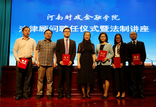 王勇军介绍了我校法律事务服务机构北京大成(郑州)律师事务所和法律顾问团队的基本情况。王雪云为受聘为学校法律顾问的李煦燕、王振涛、沈刚、马瑞、杨贺飞5位律师颁发聘书并讲话。