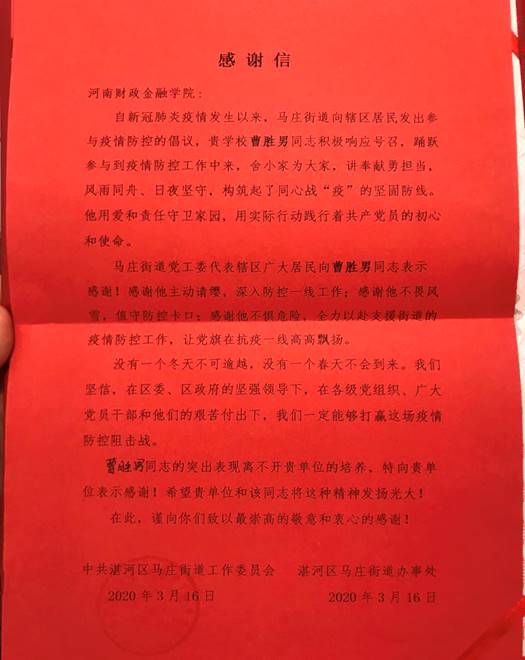 近日,我校收到平顶山市马庄街道党工委的《感谢信》,对我校艺术学院曹胜男同学在马庄街道向辖区居民疫情防控工作中的辛勤付出和积极贡献提出表扬,对我校悉心栽培曹胜男同学表示由衷的敬意和真挚的感谢。