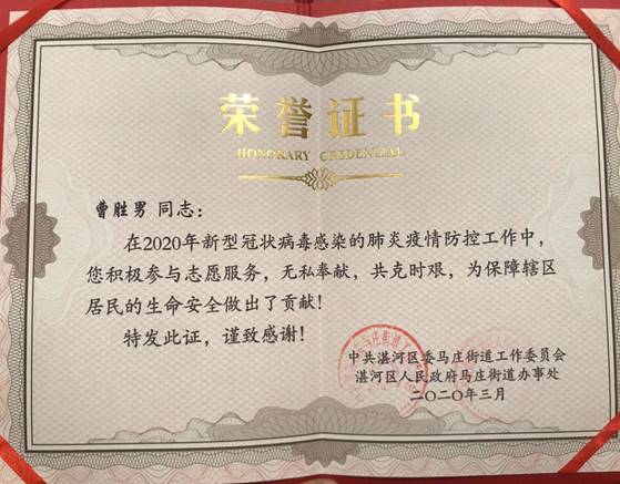 自新冠肺炎疫情发生以来,马庄街道向辖区居民发出参与疫情防控的倡议,曹胜男同学积极响应号召,踊跃参与到疫情防控工作中来,舍小家为大家,讲奉献勇担当,风雨同舟、日夜坚守,构筑起了同心战“疫”的坚固防线。她用爱和责任守卫家园,用实际行动践行着共产党员的初心和使命。马庄街道党工委代表辖区广大居民向曹胜男同学表示感谢!感谢她主动请缨,深入防控一线工作;感谢她不畏风雪,值守防控卡口;感谢她不惧危险,全力以赴支援街道的疫情防控工作,让党旗在抗疫一线高高飘扬。
