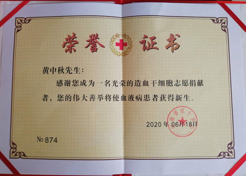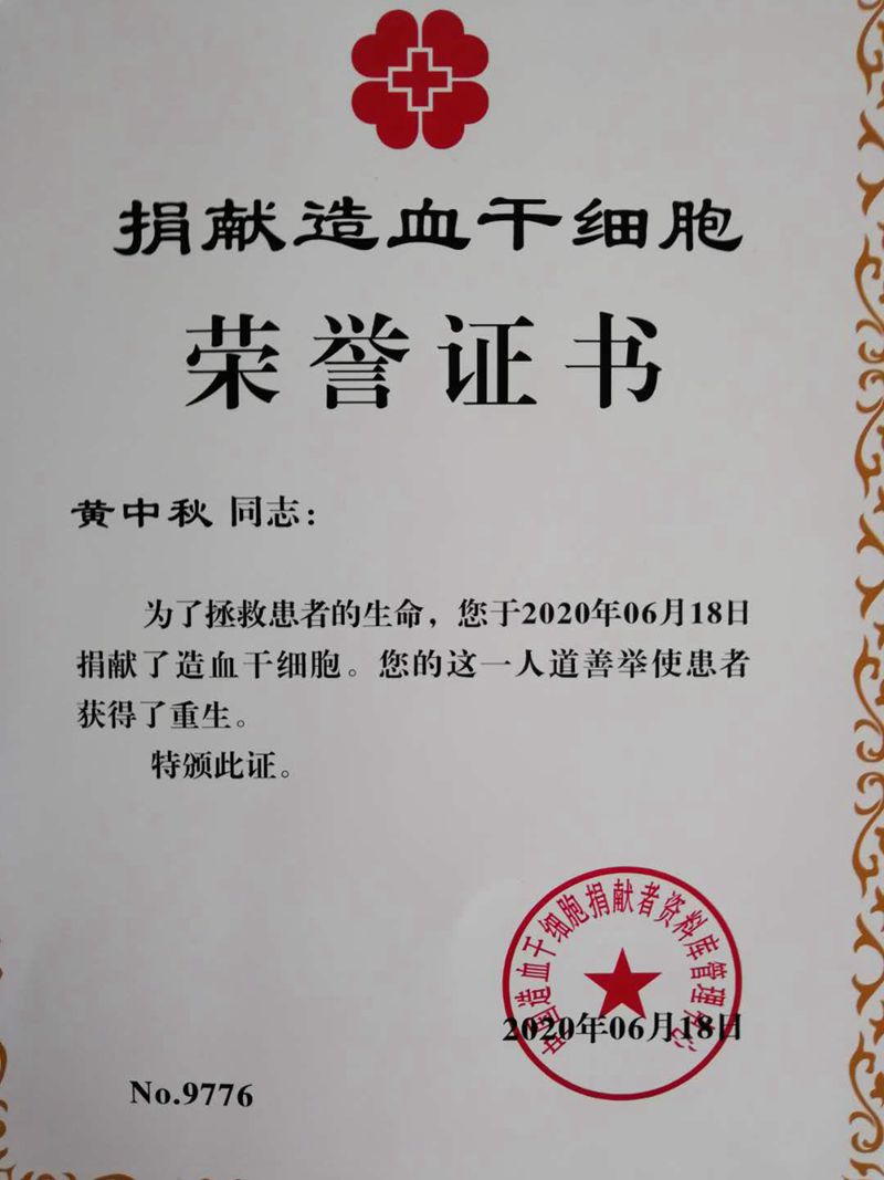 黄中秋同学于2019年8月加入了中国造血干细胞捐献者资料库。今年4月经中华骨髓库检索,他与一位血液病患者HLA(人类白细胞表面抗原)分型相合,经过全面体检,完全符合捐献造血干细胞条件。在河南省红十字会的协助下,他毫不犹豫地兑现了自己的承诺,向素昧平生的患者捐献了自己的造血干细胞,挽救了患者的生命。
