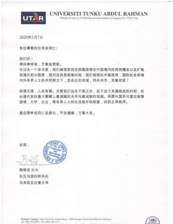 正值举国上下齐心协力抗击疫情的关键时期。2月7日,我校收到一份来自异国他乡的祝福。受马来西亚拉曼大学委托,该校社区与国际联系处向我校发来慰问信,表达对我国战胜疫情的信心和对我校师生的良好祝愿。(慰问信附后)
