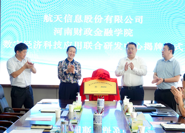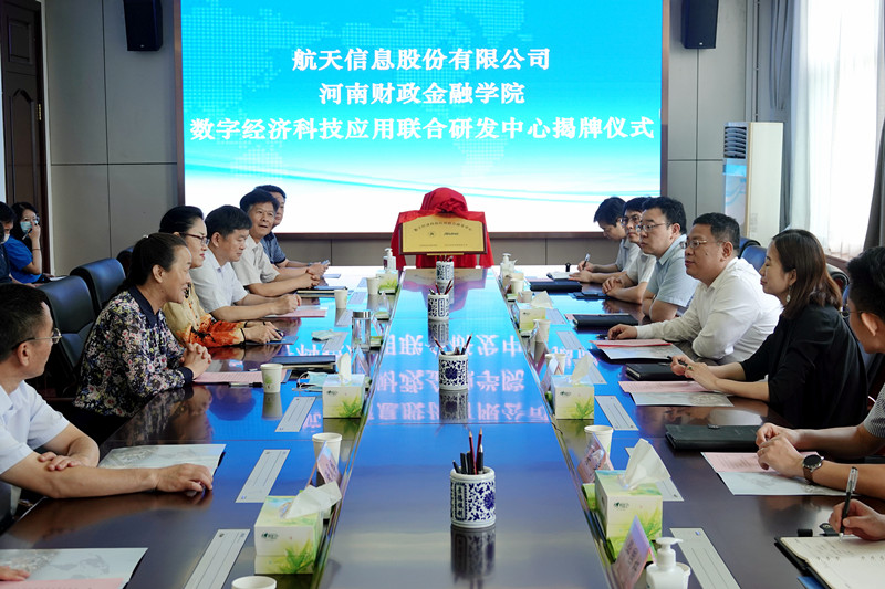 7月31日上午,航天信息股份有限公司、yl6809永利官网——数字经济科技应用联合研发中心揭牌仪式在我校举行。航天信息股份有限公司党委副书记、总经理陈荣兴,航天信息河南有限公司党支部书记、总经理李涛等一行9人,校党委书记王雪云,副校长颜敏、张风格、王孝俊出席会议。学校计算机与信息技术学院、软件学院、人工智能学院、财政税务学院、金融学院、会计学院等以及办公室、教务处、科研处、财务处、实验管理中心等部门负责同志参加会议。校党委书记王雪云主持会议。