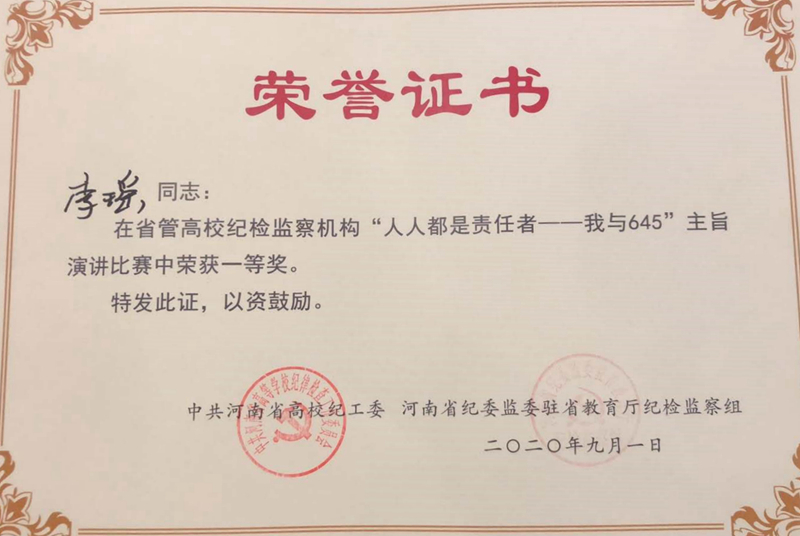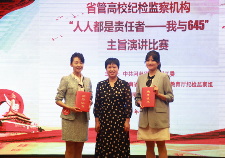 9月1日,由省高校纪工委主办,yl6809永利官网协办的省管高校纪检监察机构“人人都是责任者——我与6-45”主旨演讲比赛,在我校学术交流中心举行。我校纪委李瑶同志以《我与“6-45”的三问三答》为演讲题目,深入阐述自己对“6个方面45个问题”的认识,介绍了我校在整改落实“6-45问题”中的新方法、新经验,给在场评委和观众留下深刻印象,最终以出色的表现在参赛的40所省管高校代表中脱颖而出,以第一名的成绩荣获一等奖。