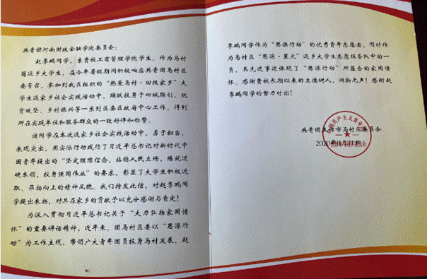 近日,共青团焦作市马村区委员会给我校发来一封表扬信,对我校工商管理学院学生赵季鹏同学积极响应共青团马村区委号召,参加“热爱马村·回报家乡”大学生返乡社会实践活动,为服务家乡建设作出的贡献提出表扬,并对我校长期坚持立德树人,培养出像赵季鹏同学这样勇于担当、积极进取的优秀大学生表示感谢。
