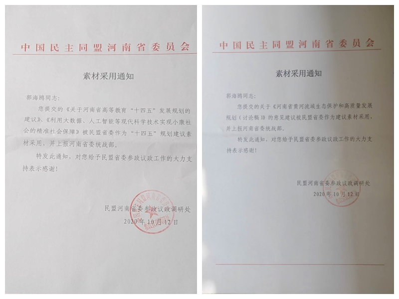 近日,民盟省委下发参政议政素材采用通知,我校民盟支部主委、期刊中心副主任郭海鸥副教授的《关于河南省高等教育“十四五”发展规划的建议》、《利用大数据、人工智能等现代科学技术实现小康社会的精准社会保障》两项提案被民盟省委作为“十四五”规划建议素材采用;《河南省黄河流域生态保护和高质量发展规划(讨论稿)》的意见建议被民盟省委作为建议素材采用,3项提案一并上报河南省委统战部。