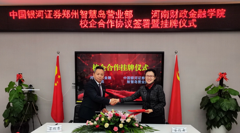 12月1日,我校与中国银河证券股份有限公司郑州智慧岛营业部校企合作、产教融合实践教学基地签约揭牌仪式在郑东新区龙子湖智慧岛利丰大厦举行。银河证券河南分公司总经理王军昭和郑州智慧岛营业部相关部门负责人,我校副校长颜敏、统计与数学学院班子成员及师生代表参加了签约揭牌仪式。