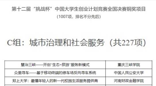 近日,第十二届“挑战杯”中国大学生创业计划竞赛成绩揭晓,由我校创新创业学院张小奎等老师指导,贾帅军、李梦磊等同学参与的项目《郑上大学:最懂年轻人的新一代校园生活服务提供商》获得全国铜奖,实现了我校“挑战杯”国赛中零的突破。