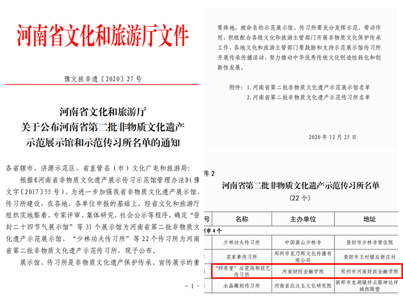 近日,《河南省文化和旅游厅关于公布河南省第二批非物质文化遗产示范展示馆和示范传习所名单的通知》(豫文旅非遗[2020]27号)公布,确定31个展示馆为河南省第二批非物质文化遗产示范展示馆,22个传习所为河南省第二批非物质文化遗产示范传习所。我校汝瓷工作室(“焠青堂”汝瓷烧制技艺传习所)名列其中。