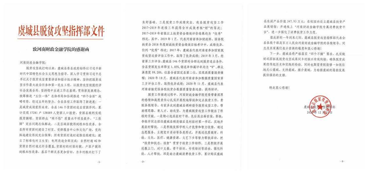 近日,我校收到虞城县脱贫攻坚指挥部发来的《感谢函》,对我校在“校地结对帮扶”虞城县及定点扶贫后吴村工作中的辛勤付出和积极贡献表示衷心感谢。