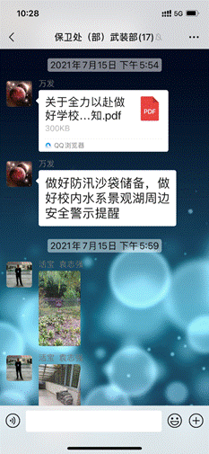 分析研判演练,提前做好预案。接到气象局发布的暴雨预警,为做好防汛准备,他走遍两校园的边边角角,查找出多处安全隐患并及时予以排除。面对暴雨后可能出现的各种安全问题和管理难题,他带领保卫处全体同志制定了多项应急方案和工作标准,并不断演练完善。7月15号,在暴雨到来之前,他通知到各个科室相关人员,按照制定的应急预案,提前做足准备,治安科做好停电门岗通行准备,做好防汛沙袋储备,做好校内水系景观湖周边安全警示提醒;消防科做好了消防报警设施备电检查,加强校内防火巡查频次;武装部做好对参加河南省第二届学生军事训练师生们的生活安全保障准备工作。