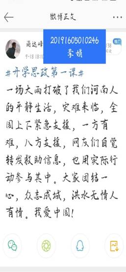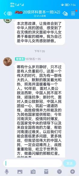 观看结束后,教师们在线展开热烈讨论,分享学习感悟与收获。教师们纷纷表示收获很大,思政专题课带领我们再一次回顾7·20暴雨中的动人场面和感人事迹,感受在防汛救灾这场大考中所看到的“中国力量”。要将灾难素材转化为思政元素,推动课程思政与专业课的深度融合,作为一名高校教师,将充分发挥课堂教学主渠道作用,挖掘梳理防汛救灾、灾后重建、疫情防控过程中涌现出的先进典型、英雄人物和感人事迹,在课堂上讲清中国优势、讲好防汛救灾故事、讲透中国精神,充分发挥立德树人作用,引导学生勇于担当使命,自觉将爱国情、强国志、报国行融入到日常工作生活中,肩负起中华民族伟大复兴的责任和重担。