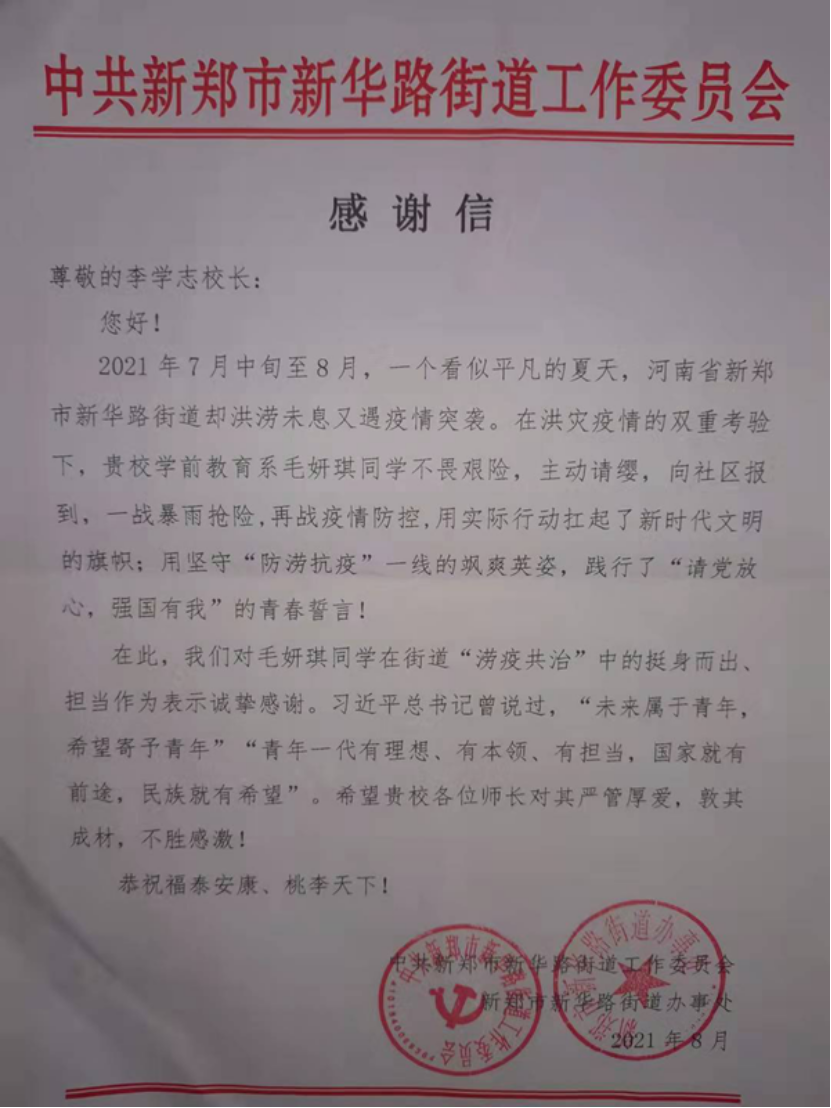 近日,我校收到了一封来自中共新郑市新华路街道工作委员会的感谢信。信中对我校教育科学学院2021级学前教育本科班一班毛妍琪同学在当地街道防汛救灾、疫情防控中主动请缨、勇于担当的作为表示感谢。