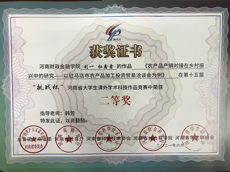 为充分做好赛前准备,我校于2020年12月启动校内选拔赛,学校高度重视提、广泛宣传、精心组织,全校共有 325名同学参与,申报项目113项,其中自然科学类1项,发明创造类7项,哲学社会科学类 105 项。为选拔和培育优秀作品,校团委邀请了来多名校外教授级专家参与作品的分类指导和赛前辅导工作,共选拔和培育了32项作品推报参加省赛角逐。在省赛决赛中,由环境经济学院郑会勤和王尘老师指导的《河南农村饮用水安全问题调查及对策---以南阳市农村为例》荣获一等奖;由国际教育学院韩芳老师指导的《农产品产销对接在乡村振兴中的研究——以驻马店市农产品加工投资贸易洽谈会为例》荣获二等奖;由文化与传播学院倪飞老师指导的《做乡村教育的守望者--以豫西山区刘相村为例》等18项作品荣获三等奖。