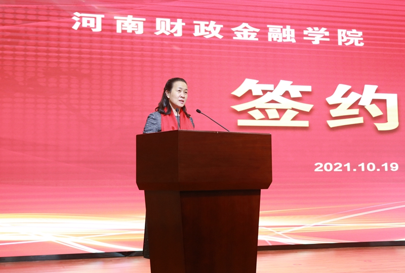 王雪云代表学校向建行河南省分行长期以来对我校事业发展给予的支持和帮助表示感谢。王雪云在简要介绍了学校历史沿革、学科专业、人才培养、师资队伍、办学特色等有关情况后指出,建行河南省分行是中国建设银行在河南省设立的一级分行,是省内金融业的主力军。长期以来,建行河南省分行积极承担国有大行的责任使命,主动整合社会资源、发挥科技优势、纾解社会痛点、赋能社会发展,在为我省经济社会发展做出卓越贡献的同时实现了自身的快速发展。建行河南省分行不仅与我校有长期业务合作关系,而且有一批我校杰出校友。今天我们签订全面战略合作协议,既是合作的深化、缘分的加强,也是人才培养的延伸和传承。校友们的敬业奉献精神和骄人业绩必将激励着学弟学妹们更好地成长和前行。真诚期待双方以此次合作为契机,不断创新合作机制,搭建更高层次、更宽领域合作平台,探索集学生联合培养、产学研协同创新、高端智库建设、惠民金融教育、企业培训于一体的长期战略合作模式,努力打造校银产学研深度融合的标杆和品牌,共同在服务河南“两个确保”大局和“十大战略”实施中奋勇争先,为谱写中原更加出彩绚丽篇章作出新的更大贡献。