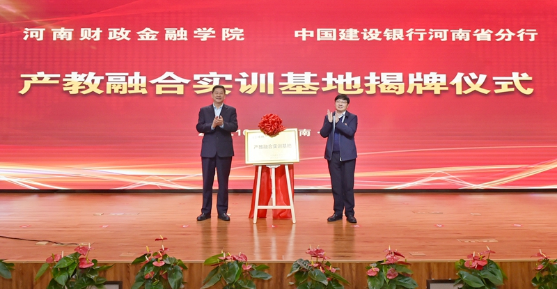 | 校长李学志与建行河南省分行党委书记、行长梁德顺共同为产教融合实训基地揭牌 |