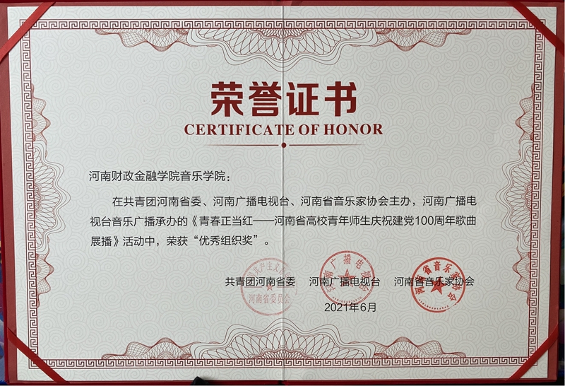 为庆祝中国共产党成立100周年,引领青年师生立大志、明大德、勇担责,努力成为堪当重任的时代新人,今年5—6月,共青团河南省委、河南广播电视台、河南省音乐家协会联合推出全省高校青年师生“红歌新唱”活动,面向全省高校师生征集优秀歌曲。我校音乐学院在“青春正当红——河南省高校青年师生庆祝建党100周年歌曲展播”中喜获“优秀组织奖”。