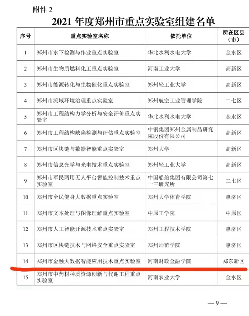 日前,郑州市科学技术局下发《关于同意组建2021年度郑州市工程技术研究中心和重点实验室的通知》,公布2021年度郑州市重点实验室组建名单和2021年度郑州市工程技术研究中心组建名单,我校申报的郑州市金融大数据智能应用技术重点实验室获批立项建设。