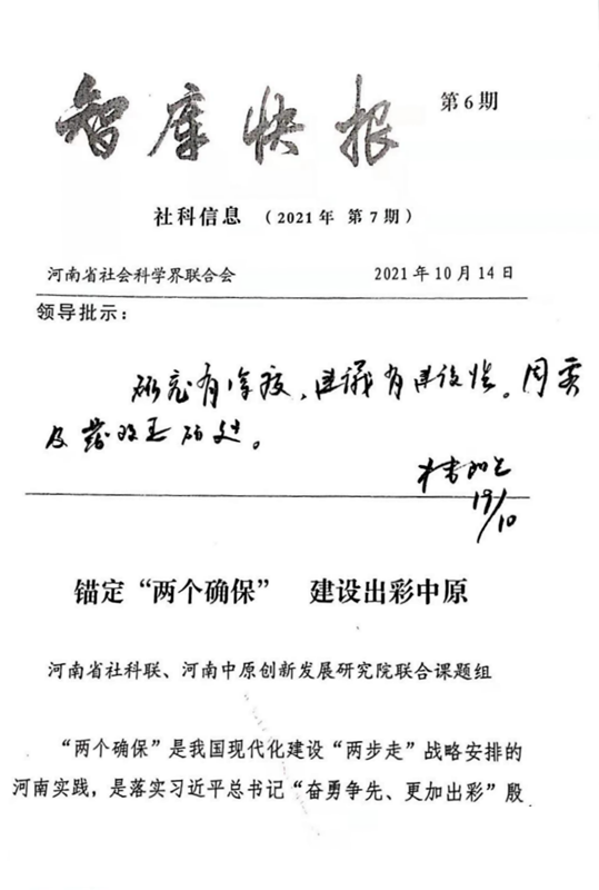 近日,我校国际经济与贸易学院高昕博士作为主要执笔人完成的研究报告《锚定“两个确保” 建设出彩中原》,在河南省社科联《智库快报》第6期上刊发,得到省委书记楼阳生同志的肯定批示。