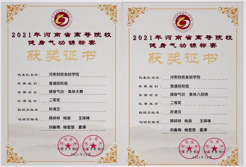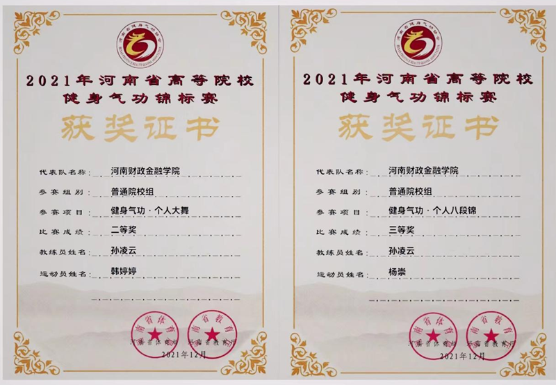 由河南省体育局、河南省教育厅主办,河南省健身气功管理中心、焦作市体育局承办的2021年河南省高等院校健身气功锦标赛近日落下帷幕。经过激烈角逐,我校由体育学院孙凌云老师担任教练,韩婷婷、杨崇、姜涛、杨思慧、王琛琢、刘春雨组成的学生代表队,在时间紧任务重的情况下,刻苦训练,努力竞攀,最终荣获了老功法八段锦集体二等奖、新功法大舞集体二等奖、大舞个人二等奖和八段锦个人三等奖的省级奖励。
