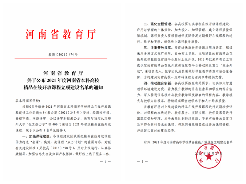 近日,《河南省教育厅关于公布2021年度河南省本科高校精品在线开放课程立项建设名单的通知》(教高〔2021〕474号 )公布,经学校申报、资格审查、网络评审、会议评审和结果公示,认定400门课程为2021年河南省精品在线开放课程,我校教师董李娜负责的《线性代数》、申利负责的《<诗经>鉴赏》2门课程获准立项建设。
