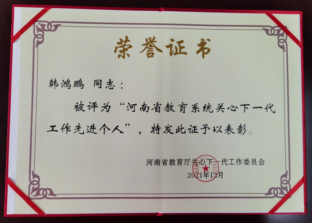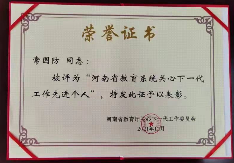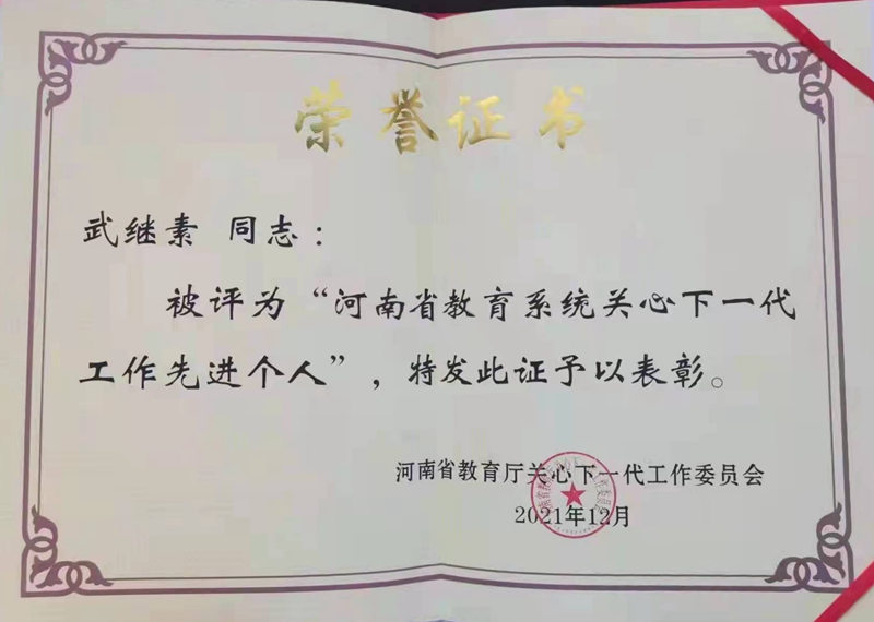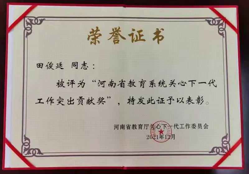 在河南省教育厅关工委成立30周年之际,省教育厅关工委决定对全省教育系统关心下一代工作先进集体和先进个人予以表彰。我校关工委秘书处、招生就业处等被授予“河南省教育系统关心下一代工作先进集体”荣誉称号;校关工委常务副主任田俊廷同志被授予“河南省教育系统关心下一代工作突出贡献奖”荣誉称号;退休教授武继素、离退休工作处综合管理科科长常国防、健康管理学院教师韩鸿鹏等同志被授予“河南省教育系统关心下一代工作先进工作者”荣誉称号。(离退休工作处 褚健/文 谢冠军/审核)