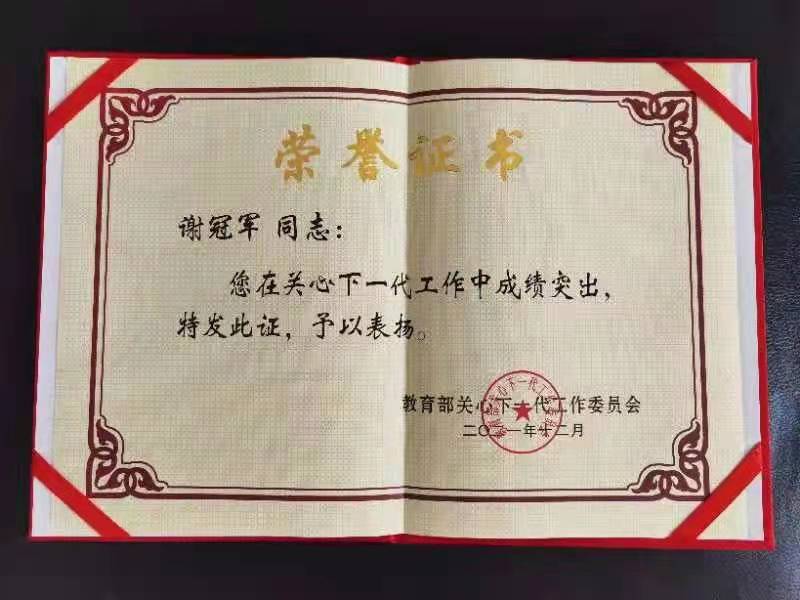 在教育部关工委成立30周年之际,教育部关心下一代工作委员会决定,对全国教育系统关心下一代工作先进集体和先进个人予以通报表扬。我校离退休工作处处长谢冠军在关心下一代工作中成绩突出,被评为“全国教育系统关心下一代工作先进工作者”,受到通报表扬。(离退休工作处 常国防/文 卓卫云/审核)