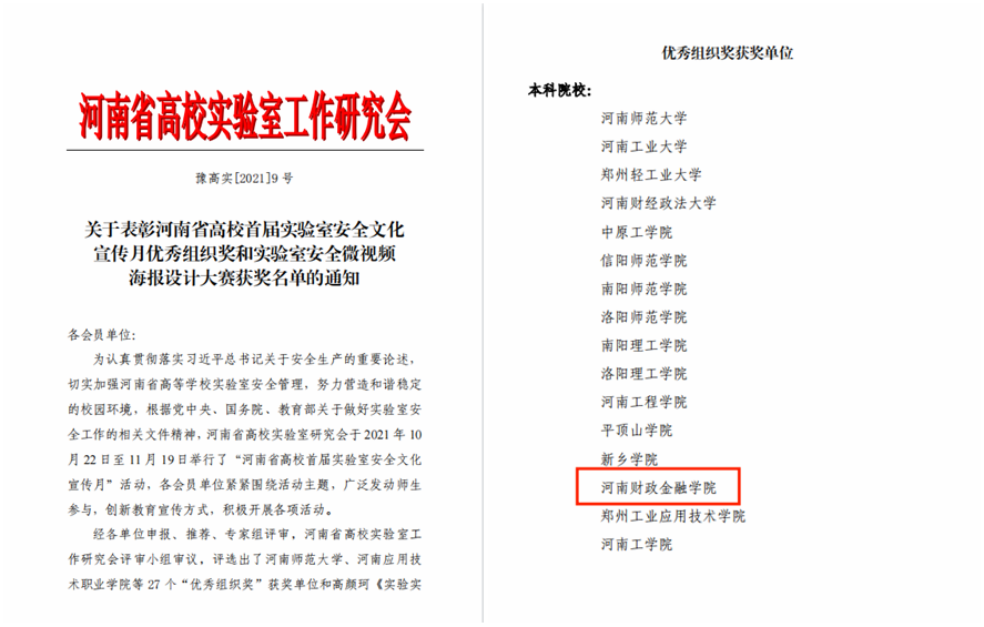 河南省高校实验室工作研究会于2021年10月18日-11月17日开展了首届“河南省高校实验室安全文化宣传月”活动。经高校申报、专家评审等环节,我校荣获“河南省高校首届实验室安全文化宣传月”活动优秀组织奖。