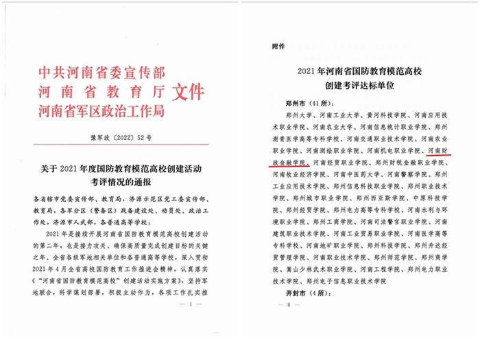 近日,中共河南省委宣传部、河南省教育厅、河南省军区政治工作局联合发文,对我省2021年国防教育模范高校创建考评情况进行通报。我校在这次考评中荣获“2021年河南省国防教育模范高校创建考评达标单位”荣誉称号。这也是我校国防教育模范高校创建活动启动以来第二次获得达标单位。