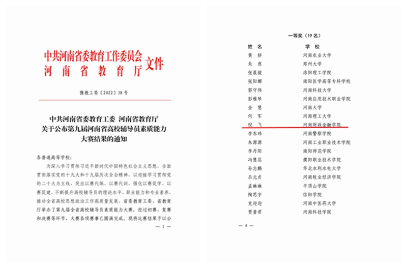 由中共河南省委教育工委、河南省教育厅主办,河南理工大学承办的第九届河南省高校辅导员素质能力大赛于5月11日落下帷幕。本次大赛共有来自全省130所高校的133名辅导员进入省赛,经过激烈角逐,我校文化与传播学院辅导员倪飞最终荣获大赛一等奖,实现了我校在河南省高校辅导员素质能力大赛中“零的突破”。