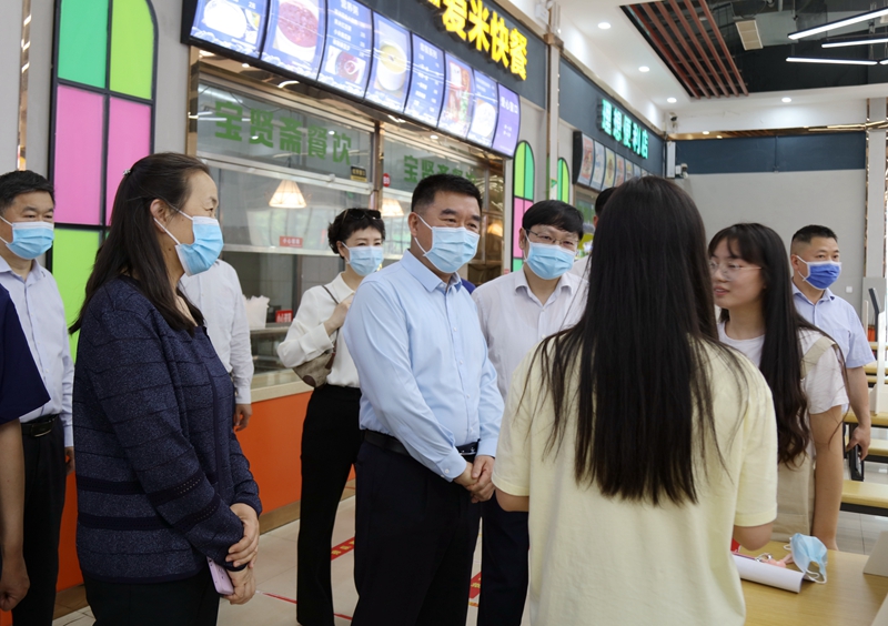 刁玉华一行先后来到学校大门口、核酸检测点、快递收发点、校园餐厅、学生宿舍,认真听取学校疫情防控等工作汇报,详细了解了校园出入管控、核酸检测现场防护、学生宿舍管理、餐厅供餐、校内快递收发防控措施等情况。