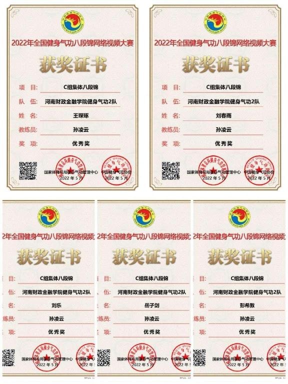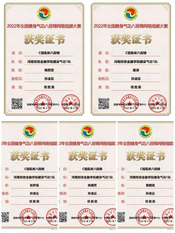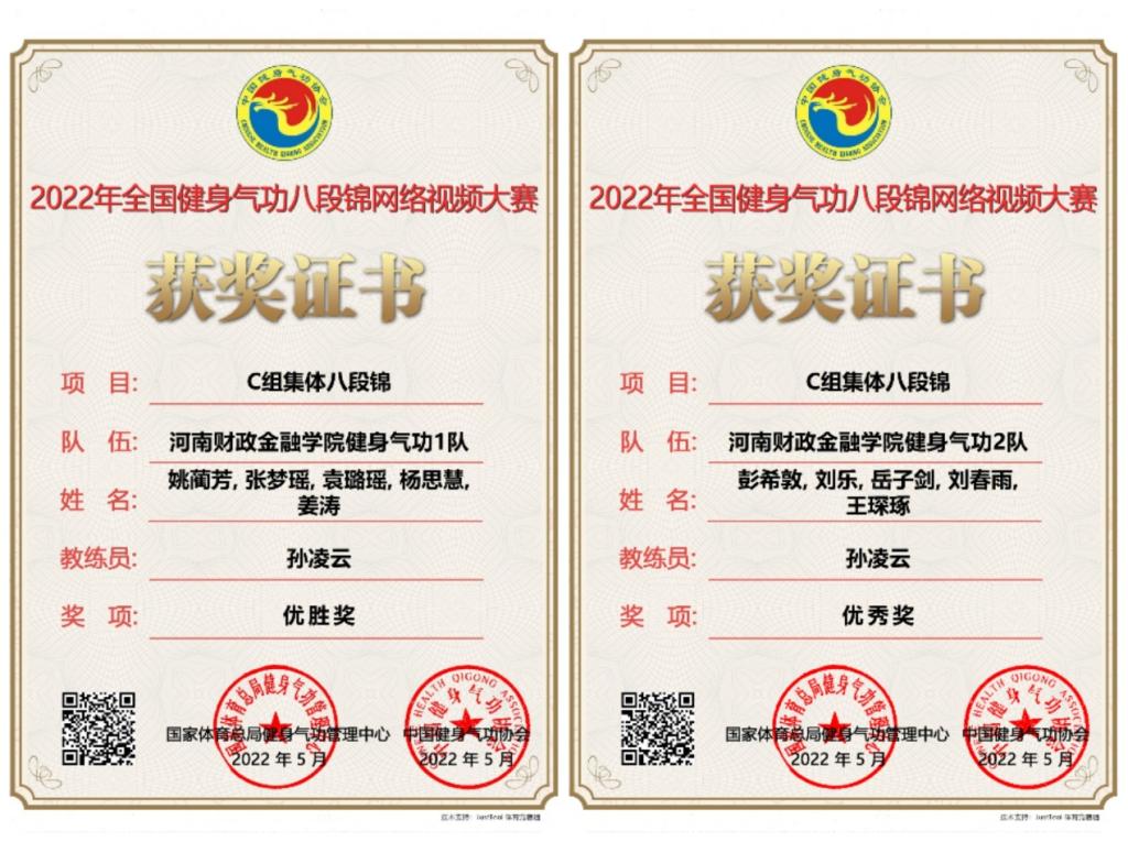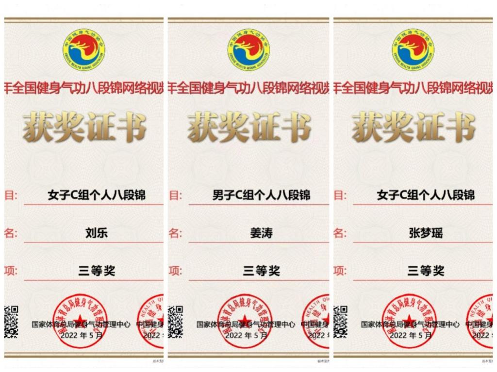 5月25日,由国家体育总局健身气功管理中心、国家体育总局群体司、中华全国体育总会群体部、中国健身气功协会主办的2022年全国健身气功八段锦网络视频大赛落下帷幕。我校代表队参加了C组的两项团体赛和三项个人赛,分别取得了团体赛优胜奖、优秀奖、3个个人赛三等奖的成绩。
