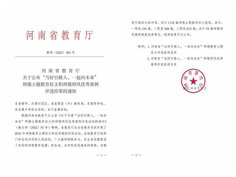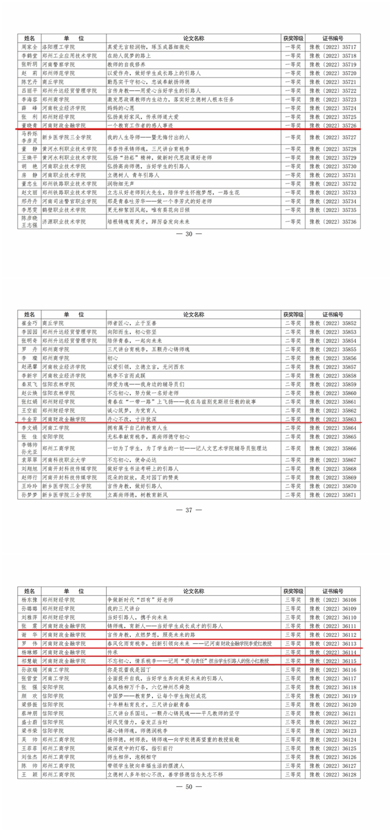 在推荐参加上级部门组织的“出彩河南人”活动中,音乐学院樊霄英老师荣获“出彩河南人”2022最美教师优秀奖。推荐参加省教育厅师德主题征文活动中7件作品获奖,体育学院董晓青《一个教育工作者的感人事迹》荣获一等奖,教育科学学院牛金芳《丹心不改,寸许犹深》荣获二等奖,教育科学学院张震《铸师魂,育新人——当好学生成长成才的引路人》、国际教育学院谢华《言传身教点燃梦想照亮未来的路》、网络信息管理中心罗伟《春风化雨育桃李 创新引领向未来—记yl6809永利官网李爱红教授》、财政税务学院杨琳娜《传承》、计算机与人工智能学院祁慧敏《不忘初心情系桃李—记用“爱与责任”担当学生引路人的张小红教授》荣获三等奖。