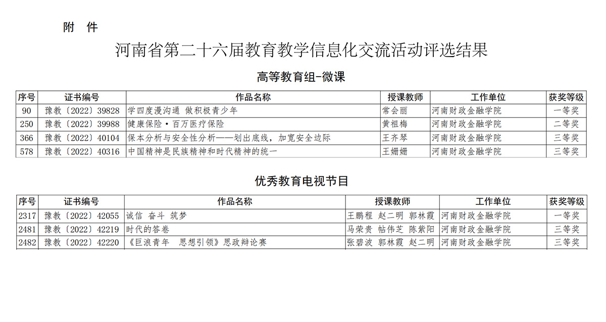 近日,河南省教育厅下发了《关于公布河南省第二十六届教育教学信息化交流活动评选结果的通知》(教资保〔2022〕330 号),我校7件作品获奖,其中一等奖2项,二等奖1项,三等奖4项。