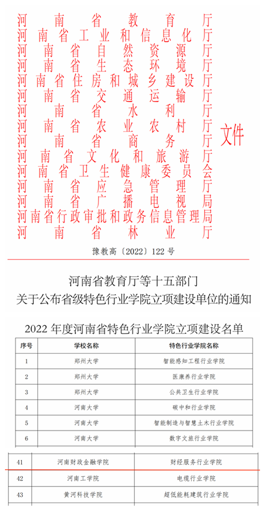 近日,经过各高校申报、行业主管部门审核、专家评议、答辩评审等环节,河南省教育厅、河南省工业和信息化厅等十五部门下发《关于公布省级特色行业学院立项建设单位的通知》(豫教高〔2022〕122号),我校财经服务行业学院获批省级特色行业学院立项建设。