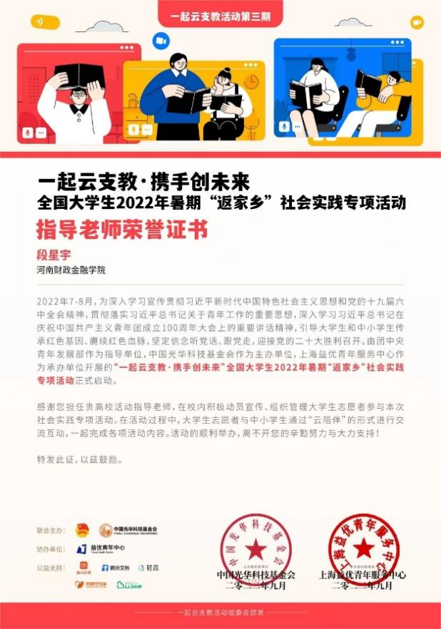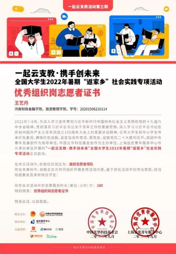 今年7至8月,由团中央青年发展部作为指导单位,中国光华科技基金作为主办单位,益优青年中心作为承办单位,在全国范围内开展“一起云支教,携手创未来”全国大学生2022年暑期“返家乡”社会实践专项活动,得到了全国各大高校的积极参与。近期,组办单位在基层申报、组织评议环节的基础上,通报表彰了231所突出贡献单位、172名突出贡献个人以及178所“一起云支教”社会实践活动基地合作单位。