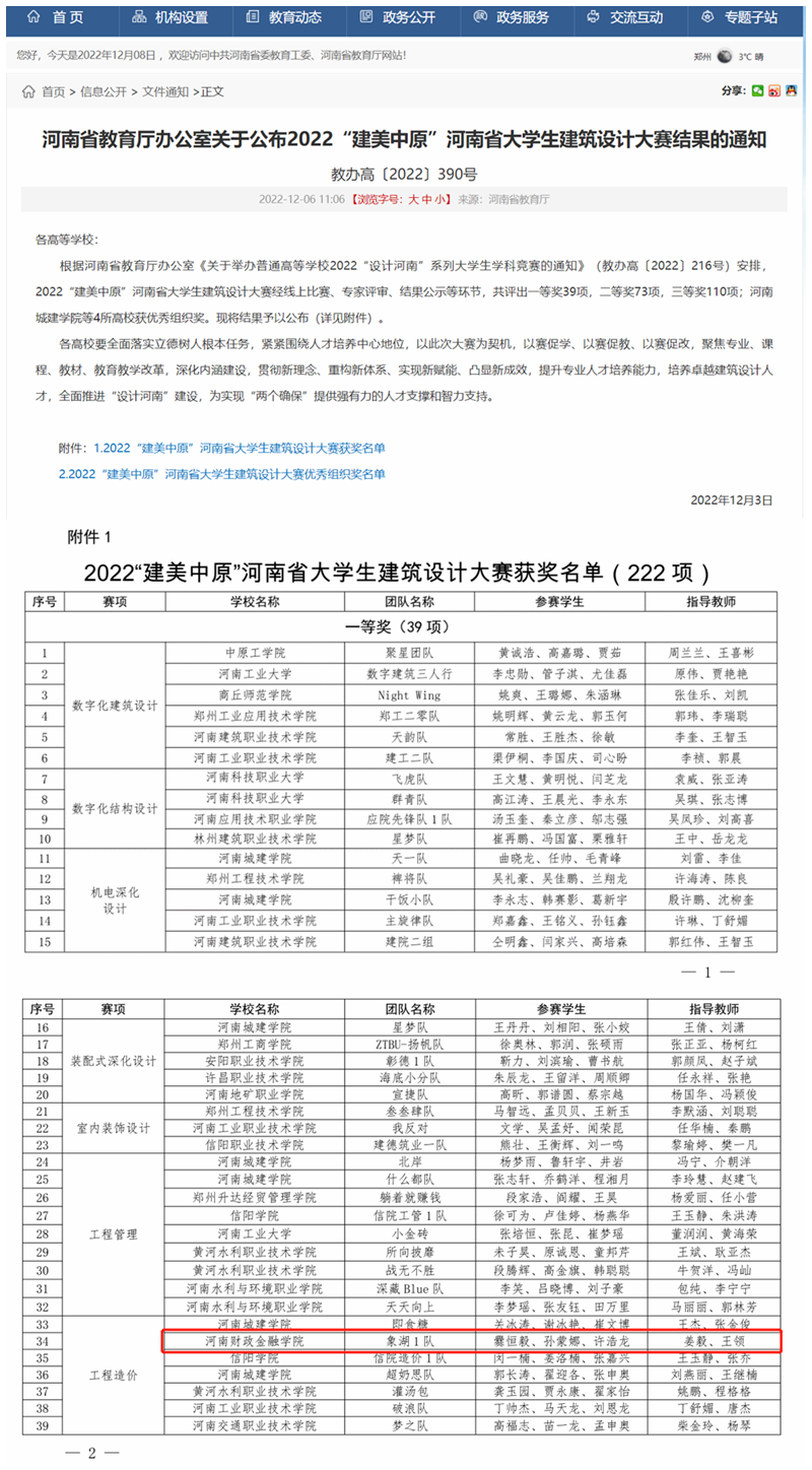 11月16日,由河南省教育厅举办,河南城建学院、河南省土木建筑学会承办的2022“建美中原”河南省大学生建筑设计大赛落下帷幕,来自全省69所院校、335支队伍通过线上方式参赛。近日,经过评审,大赛结果揭晓,我校参赛团队荣获工程造价赛项一等奖。