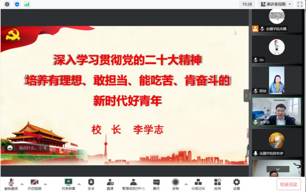 12月15日晚,校长李学志通过腾讯会议的形式,以“深入学习贯彻党的二十大精神,培养有理想、敢担当、能吃苦、肯奋斗的新时代好青年”为题,为金融学院、会计学院300余名师生党员上了一堂生动精彩的专题党课。