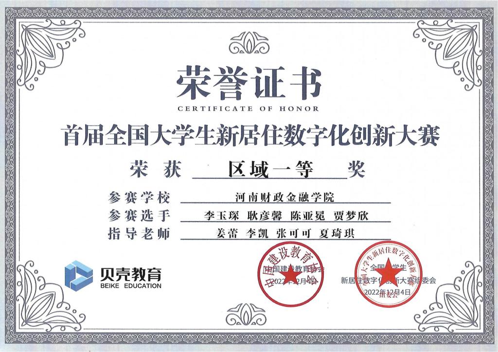 近日,首届全国大学生新居住数字化创新大赛落下帷幕。我校2021级房地产开发与管理专业学生李玉琛、耿彦馨、陈亚冕、贾梦欣组成的代表队获得区域一等奖,并代表学校参加全国总决赛荣获三等奖。工程经济学院房地产教研室教师姜蕾、李凯、张可可、夏琪琦获优秀指导教师称号。